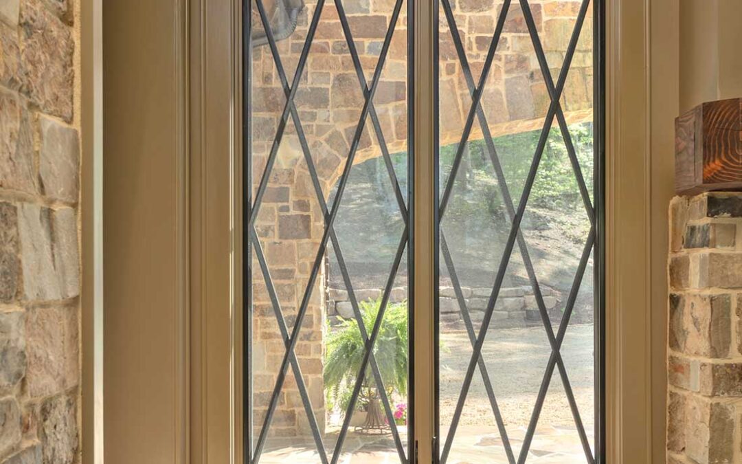 In the dining area, a unique coffered ceiling incorporates vintage wine boxes that the owners have collected during visits to France. Stonework on interior walls also evoke the concept of the home’s organic growth.